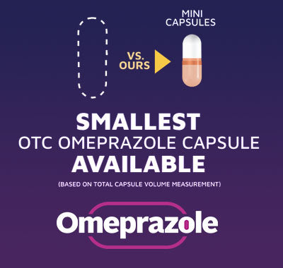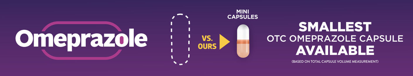 Omeprazole Delayed Release Mini Capsules are the smallest OTC Omeprazole capsules available (based on total capsule volume measurement).