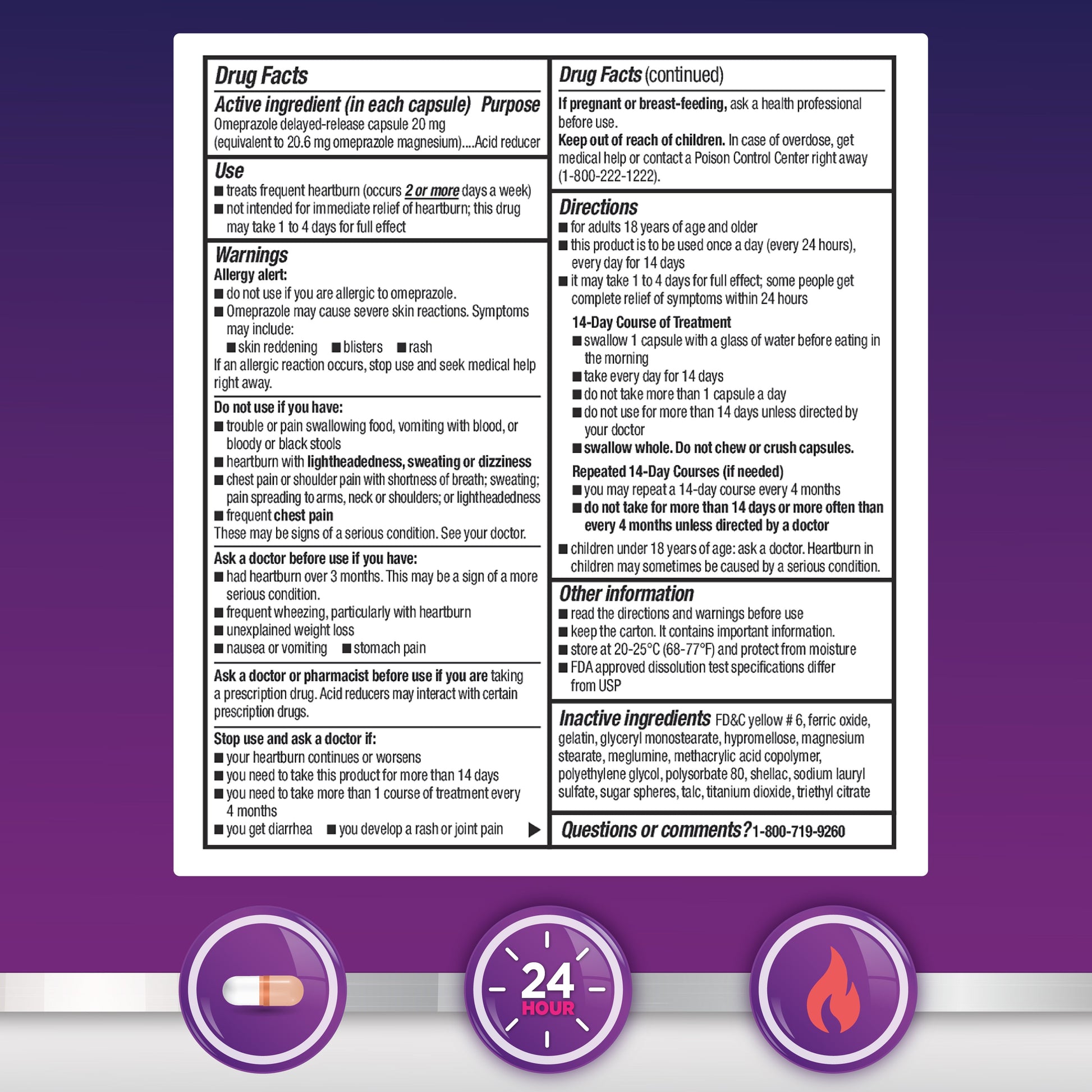 Allergy alert: Do not use if you are allergic to omeprazole. Omeprazole may cause severe skin reactions. Symptoms may include: skin reddening; blisters; rash. If an allergic reaction occurs, stop use and seek medical help right away. Do not use if you have: trouble or pain swallowing food, vomiting with blood, or bloody or black stools; heartburn with lightheadedness, sweating or dizziness; chest pain or shoulder pain with shortness of breath; sweating; pain spreading to arms, neck or shoulders; or lightheadedness; frequent chest pain. These may be signs of a serious condition. See your doctor. Ask a doctor before use if you have: had heartburn over 3 months. This may be a sign of a more serious condition; frequent wheezing, particularly with heartburn; unexplained weight loss; nausea or vomiting; stomach pain. Ask a doctor or pharmacist before use if you are taking a prescription drug. Acid reducers may interact with certain prescription drugs. Stop use and ask a doctor if: your heartburn continues or worsens; you need to take this product for more than 14 days; you need to take more than 1 course of treatment every 4 months; you get diarrhea; you develop a rash or joint pain. If pregnant or breast-feeding, ask a health professional before use. Keep out of reach of children. In case of overdose, get medical help or contact a Poison Control Center right away (1-800-222-1222).