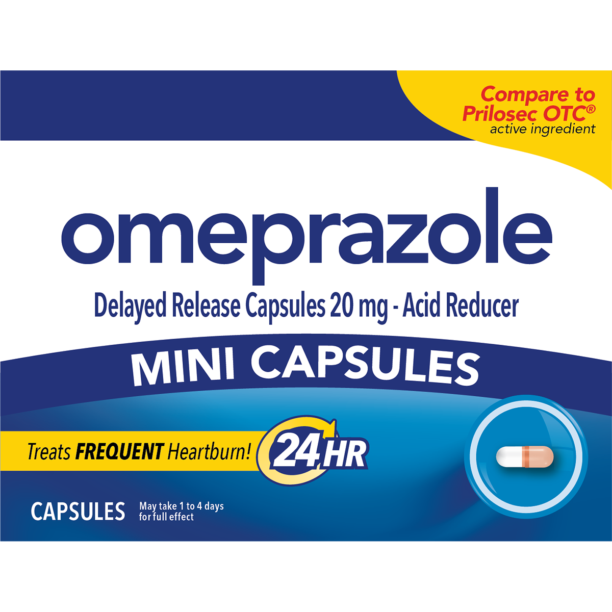Stop the painful burning sensation of frequent heartburn before it begins with Omeprazole Delayed Release Mini Capsules 20 mg. These mini capsules are the smallest OTC Omeprazole capsules available and 40% smaller than other OTC Omeprazole capsules (based on total capsule volume measurement). When used as directed for 14 days, Omeprazole prevents heartburn that is frequent in nature and provides long-lasting, 24-hour relief so you can enjoy every moment with family and friends. This heartburn medicine may take one to four days for full effect, although some people get complete relief of symptoms within 24 hours. Proton Pump Inhibitors (PPIs), like Omeprazole, work differently from antacid tablets and other acid reducer pills. These heartburn relief treatments only neutralize the stomach acid and provide shorter relief (less than 24 hours). Omeprazole stops acid production at the source, preventing the acid that causes heartburn symptoms for relief that lasts all day and night. This heartburn medicine is a 14-day course of treatment that should be taken once every 24 hours for 14 days to treat frequent heartburn flare-ups. Omeprazole is the #1 Active Ingredient for Frequent Heartburn‡. For adults 18 years and older suffering from frequent heartburn that occurs two or more days a week.